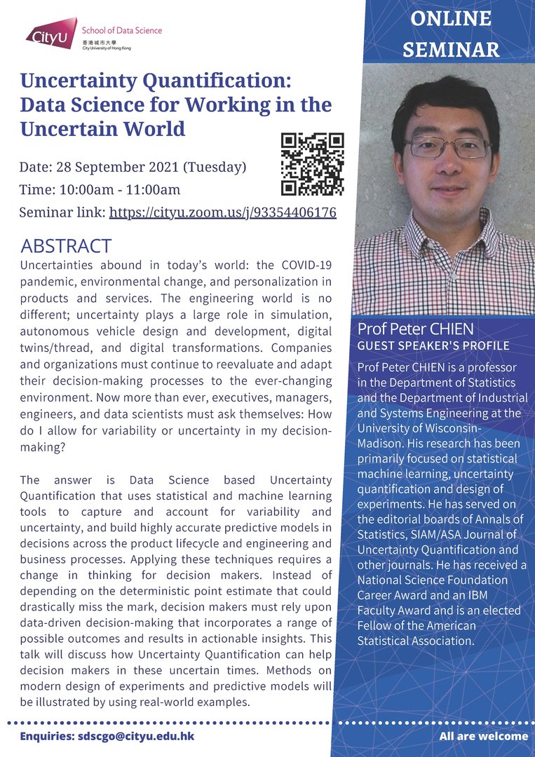 Prof Peter CHIEN is a professor in the Department of Statistics and the Department of Industrial and Systems Engineering at the University of Wisconsin-Madison. His research has been primarily focused on statistical machine learning, uncertainty quantification and design of experiments. He has served on the editorial boards of Annals of Statistics, SIAM/ASA Journal of Uncertainty Quantification and other journals. He has received a National Science Foundation Career Award and an IBM Faculty Award and is an elected Fellow of the American Statistical Association.