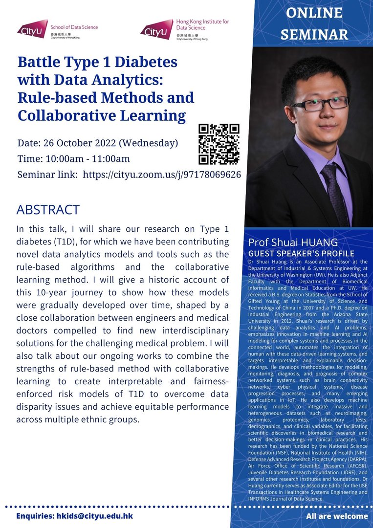 Dr Shuai Huang is an Associate Professor at the Department of Industrial & Systems Engineering at the University of Washington (UW). He is also Adjunct Faculty with the Department of Biomedical Informatics and Medical Education at UW. He received a B.S. degree on Statistics from the School of Gifted Young at the University of Science and Technology of China in 2007 and a Ph.D. degree on Industrial Engineering from the Arizona State University in 2012. Shuai’s research is driven by challenging data analytics and AI problems, emphasizes innovation in machine learning and AI modeling for complex systems and processes in the connected world, automates the integration of human with these data-driven learning systems, and targets interpretable and explainable decision-makings. He develops methodologies for modeling, monitoring, diagnosis, and prognosis of complex networked systems such as brain connectivity networks, cyber physical systems, disease progression processes, and many emerging applications in IoT. He also develops machine learning models to integrate massive and heterogeneous datasets such as neuroimaging, genomics, proteomics, laboratory tests, demographics, and clinical variables, for facilitating scientific discoveries in biomedical research and better decision-makings in clinical practices. His research has been funded by the National Science Foundation (NSF), National Institute of Health (NIH), Defense Advanced Research Projects Agency (DARPA), Air Force Office of Scientific Research (AFOSR), Juvenile Diabetes Research Foundation (JDRF), and several other research institutes and foundations. Dr Huang currently serves as Associate Editor for the IISE Transactions in Healthcare Systems Engineering and INFORMS Journal of Data Science.