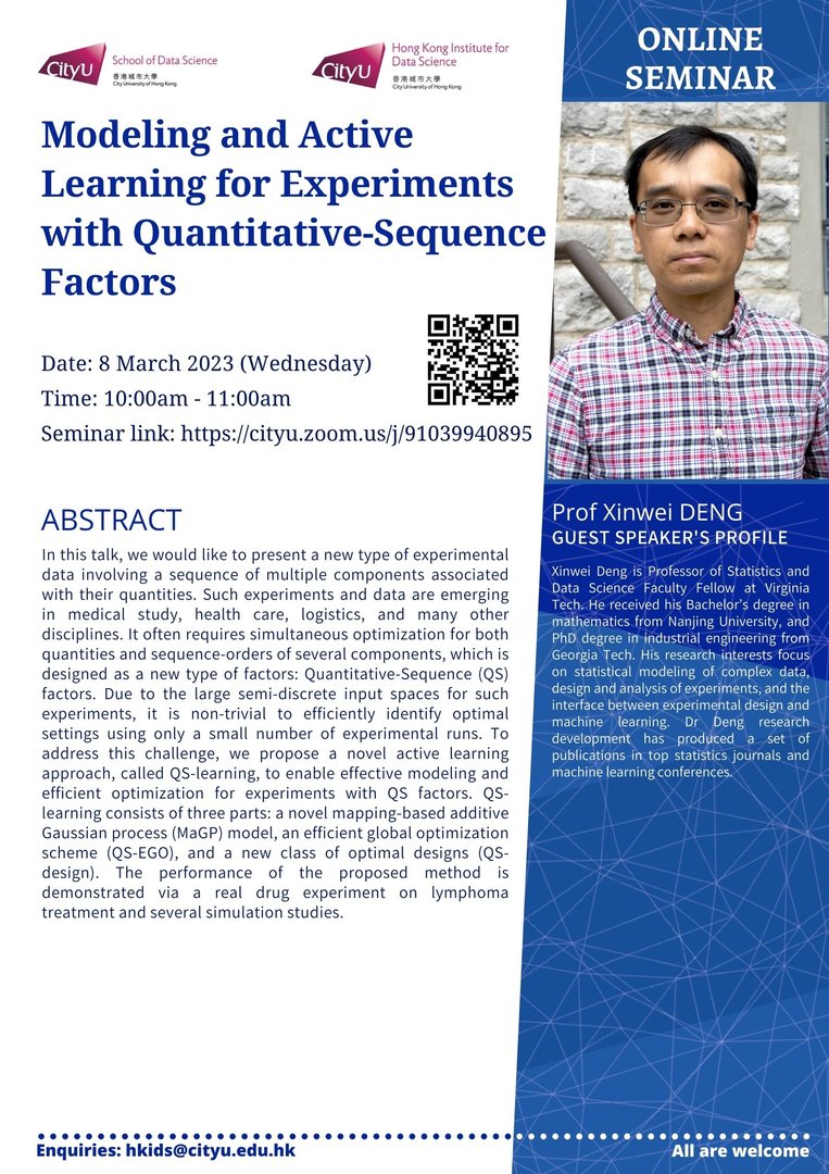 Xinwei Deng is Professor of Statistics and Data Science Faculty Fellow at Virginia Tech. He received his Bachelor’s degree in mathematics from Nanjing University, and PhD degree in industrial engineering from Georgia Tech. His research interests focus on statistical modeling of complex data, design and analysis of experiments, and the interface between experimental design and machine learning. Dr. Deng research development has produced a set of publications in top statistics journals and machine learning conferences.