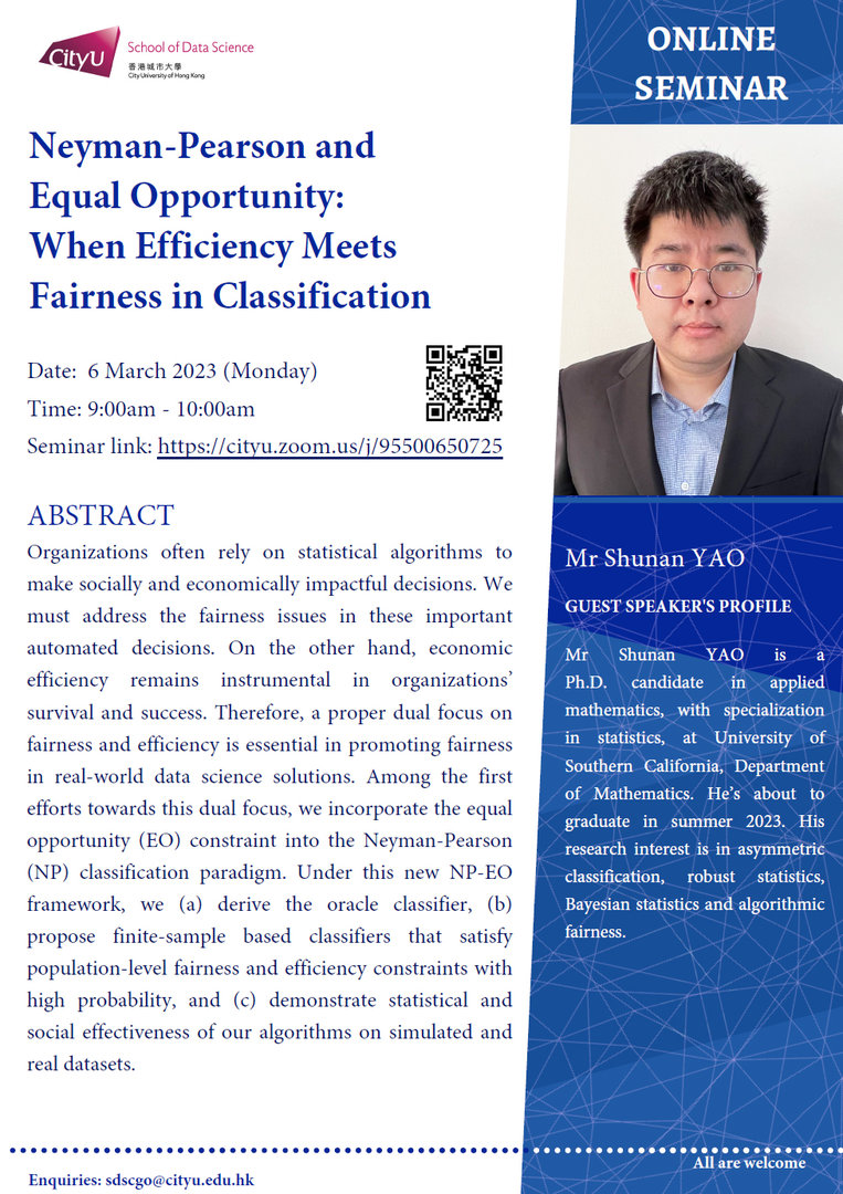 Mr Shunan YAO is a Ph.D. candidate in applied mathematics, with specialization in statistics, at University of Southern California, Department of Mathematics. He’s about to graduate in summer 2023. His research interest is in asymmetric classification, robust statistics, Bayesian statistics and algorithmic fairness.