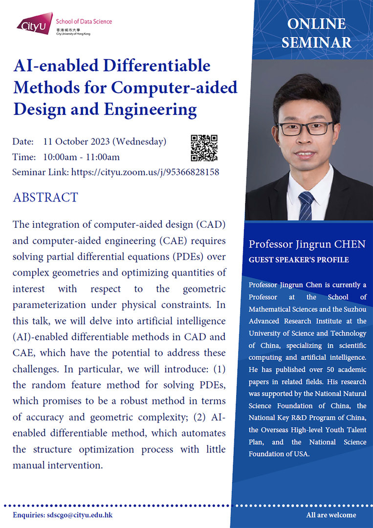 The integration of computer-aided design (CAD) and computer-aided engineering (CAE) requires solving partial differential equations (PDEs) over complex geometries and optimizing quantities of interest with respect to the geometric parameterization under physical constraints. In this talk, we will delve into artificial intelligence (AI)-enabled differentiable methods in CAD and CAE, which have the potential to address these challenges. In particular, we will introduce: (1) the random feature method for solving PDEs, which promises to be a robust method in terms of accuracy and geometric complexity; (2) AI-enabled differentiable method, which automates the structure optimization process with little manual intervention.