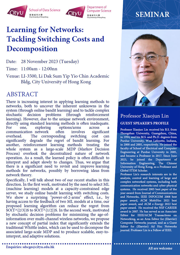 Professor Xiaojun Lin received his B.S. from Zhongshan University, Guangzhou, China, in 1994, and his M.S. and Ph.D. degrees from Purdue University, West Lafayette, Indiana, in 2000 and 2005, respectively. He joined the faculty of School of Electrical and Computer Engineering at Purdue University in 2005, and became a Professor in 2017. Since June 2023, he joined the Department of Information Engineering, The Chinese University of Hong Kong, as a Professor and Global STEM Scholar.