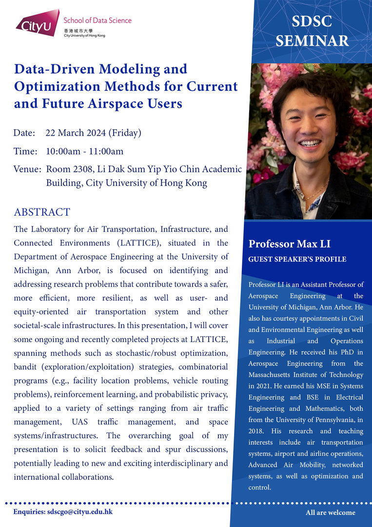 Professor LI is an Assistant Professor of Aerospace Engineering at the University of Michigan, Ann Arbor. He also has courtesy appointments in Civil and Environmental Engineering as well as Industrial and Operations Engineering. Max received his PhD in Aerospace Engineering from the Massachusetts Institute of Technology in 2021. He earned his MSE in Systems Engineering and BSE in Electrical Engineering and Mathematics, both from the University of Pennsylvania, in 2018. Max’s research and teaching interests include air transportation systems, airport and airline operations, Advanced Air Mobility, networked systems, as well as optimization and control.