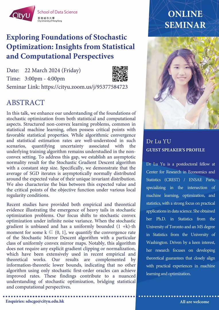 Dr Lu Yu is a postdoctoral fellow at Center for Research in Economics and Statistics (CREST) / ENSAE Paris, specializing in the intersection of machine learning, optimization, and statistics, with a strong focus on practical applications in data science. She obtained her Ph.D. in Statistics from the University of Toronto and an MS degree in Statistics from the University of Washington. Driven by a keen interest, her research focuses on developing theoretical guarantees that closely align with practical experiences in machine learning and optimization.
