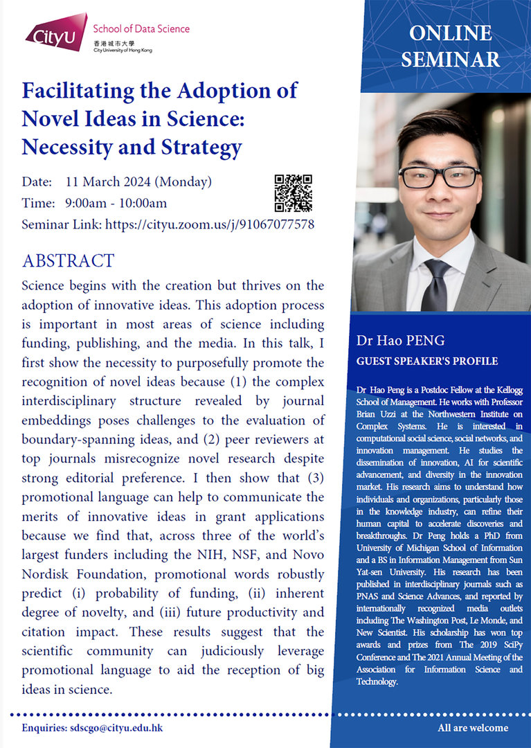 Dr Hao Peng is a Postdoc Fellow at the Kellogg School of Management. He works with Professor Brian Uzzi at the Northwestern Institute on Complex Systems. He is interested in computational social science, social networks, and innovation management. He studies the dissemination of innovation, AI for scientific advancement, and diversity in the innovation market. His research aims to understand how individuals and organizations, particularly those in the knowledge industry, can refine their human capital to accelerate discoveries and breakthroughs. Dr Peng holds a PhD from University of Michigan School of Information and a BS in Information Management from Sun Yat-sen University. His research has been published in interdisciplinary journals such as PNAS and Science Advances, and reported by internationally recognized media outlets including The Washington Post, Le Monde, and New Scientist. His scholarship has won top awards and prizes from The 2019 SciPy Conference and The 2021 Annual Meeting of the Association for Information Science and Technology.