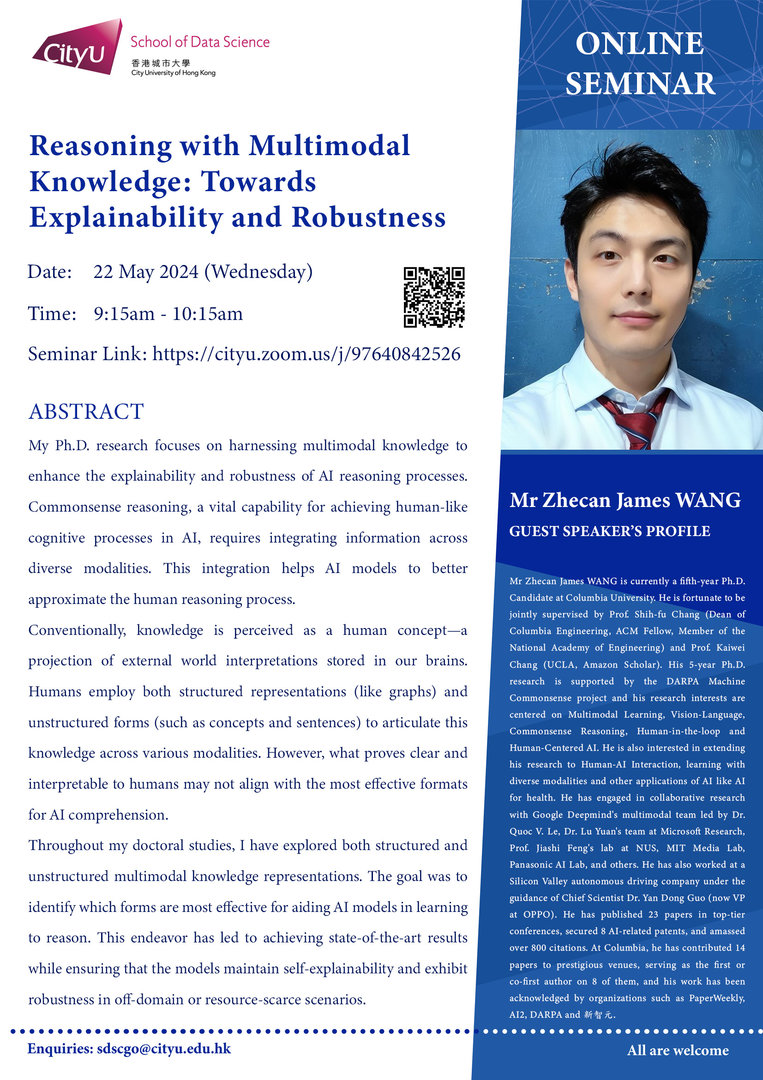 Mr Zhecan James WANG is currently a fifth-year Ph.D. Candidate at Columbia University. He is fortunate to be jointly supervised by Prof. Shih-fu Chang (Dean of Columbia Engineering, ACM Fellow, Member of the National Academy of Engineering) and Prof. Kaiwei Chang (UCLA, Amazon Scholar). His 5-year Ph.D. research is supported by the DARPA Machine Commonsense project and his research interests are centred on Multimodal Learning, Vision-Language, Commonsense Reasoning, Human-in-the-loop and Human-Centered AI. He is also interested in extending his research to Human-AI Interaction, learning with diverse modalities and other applications of AI like AI for health. He has engaged in collaborative research with Google Deepmind's multimodal team led by Dr. Quoc V. Le, Dr. Lu Yuan's team at Microsoft Research, Prof. Jiashi Feng's lab at NUS, MIT Media Lab, Panasonic AI Lab, and others. He has also worked at a Silicon Valley autonomous driving company under the guidance of Chief Scientist Dr. Yan Dong Guo (now VP at OPPO). He has published 23 papers in top-tier conferences, secured 8 AI-related patents, and amassed over 800 citations. At Columbia, he has contributed 14 papers to prestigious venues, serving as the first or co-first author on 8 of them, and his work has been acknowledged by organizations such as PaperWeekly, AI2, DARPA and新智元.