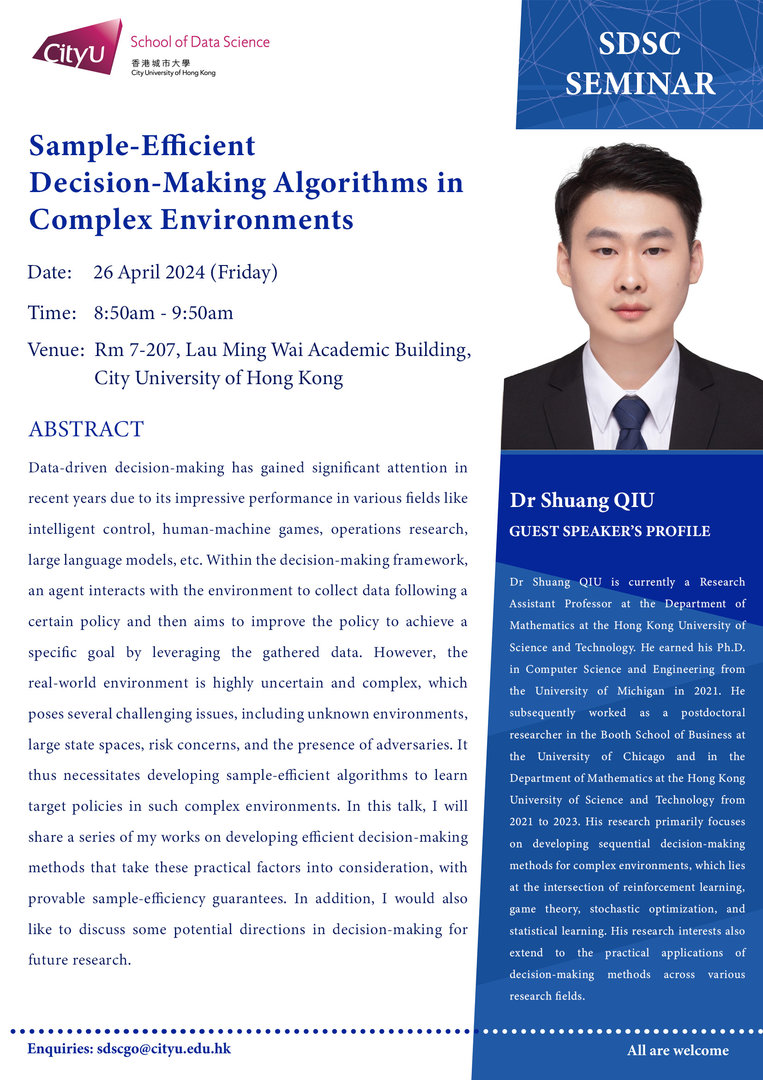Dr Shuang QIU is currently a Research Assistant Professor at the Department of Mathematics at the Hong Kong University of Science and Technology. He earned his Ph.D. in Computer Science and Engineering from the University of Michigan in 2021. He subsequently worked as a postdoctoral researcher in the Booth School of Business at the University of Chicago and in the Department of Mathematics at the Hong Kong University of Science and Technology from 2021 to 20234. His research primarily focuses on developing sequential decision-making methods for complex environments, which lies at the intersection of reinforcement learning, game theory, stochastic optimization, and statistical learning. His research interests also extend to the practical applications of decision-making methods across various research fields.