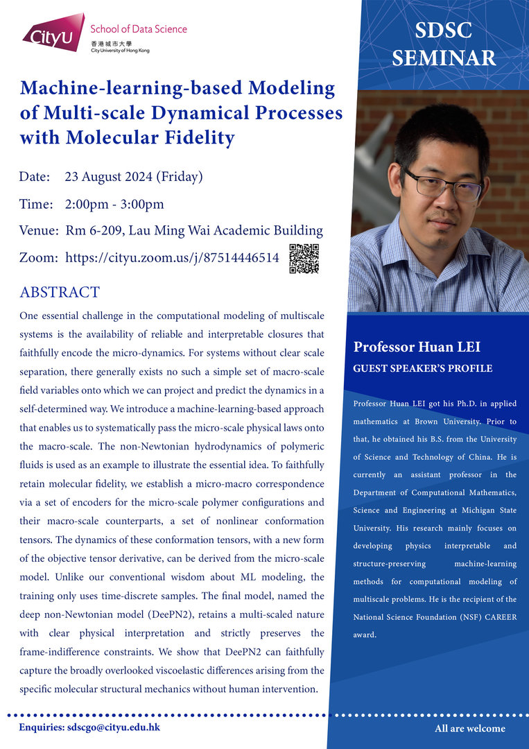 Professor Huan LEI got his Ph.D. in applied mathematics at Brown University. Prior to that, he obtained his B.S. from the University of Science and Technology of China. He is currently an assistant professor in the Department of Computational Mathematics, Science and Engineering at Michigan State University. His research mainly focuses on developing physics interpretable and structure-preserving machine-learning methods for computational modeling of multiscale problems. He is the recipient of the National Science Foundation(NSF)CAREER award.