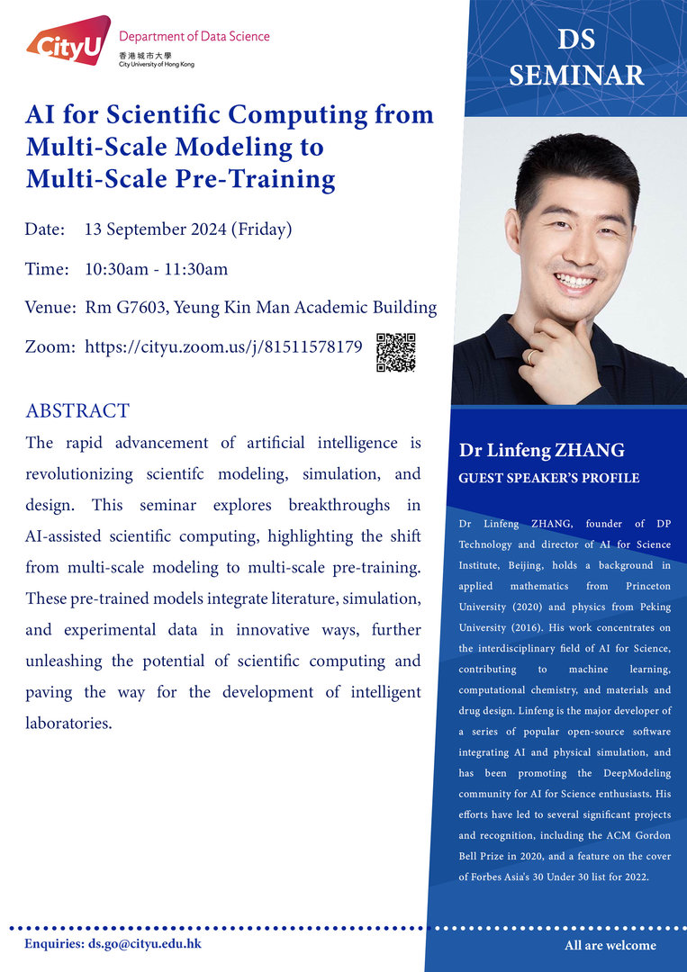 Dr Linfeng ZHANG, founder of DP Technology and director of AI for Science Institute, Beijing, holds a background in applied mathematics from Princeton University (2020) and physics from Peking University (2016). His work concentrates on the interdisciplinary field of AI for Science, contributing to machine learning, computational chemistry, and materials and drug design. Linfeng is the major developer of a series of popular open-source software integrating AI and physical simulation, and has been promoting the DeepModeling community for AI for Science enthusiasts. His efforts have led to several significant projects and recognition, including the ACM Gordon Bell Prize in 2020, and a feature on the cover of Forbes Asia's 30 Under 30 list for 2022.