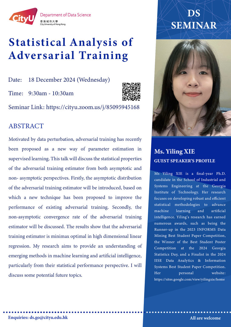 Ms Yiling XIE is a final-year Ph.D. candidate in the School of Industrial and Systems Engineering at the Georgia Institute of Technology. Her research focuses on developing robust and efficient statistical methodologies to advance machine learning and artificial intelligence. Yiling's research has earned numerous awards, such as being the Runner-up in the 2023 INFORMS Data Mining Best Student Paper Competition, the Winner of the Best Student Poster Competition at the 2024 Georgia Statistics Day, and a Finalist in the 2024 IISE Data Analytics & Information Systems Best Student Paper Competition. Her personal website: Here