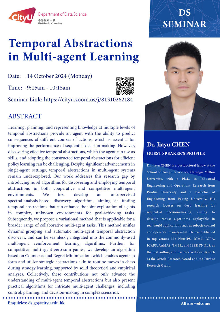 Dr Jiayu CHEN is a postdoctoral fellow at the School of Computer Science, Carnegie Mellon University, with a Ph.D. in Industrial Engineering and Operations Research from Purdue University and a Bachelor of Engineering from Peking University. His research focuses on deep learning for sequential decision-making, aiming to develop robust algorithms deployable in real-world applications such as robotic control and operation management. He has published in top venues like NeurIPS, ICML, ICRA, ICAPS, AAMAS, TMLR, and IEEE TNNLS, as the first author, and has received awards such as the Oracle Research Award and the Purdue Research Grant.