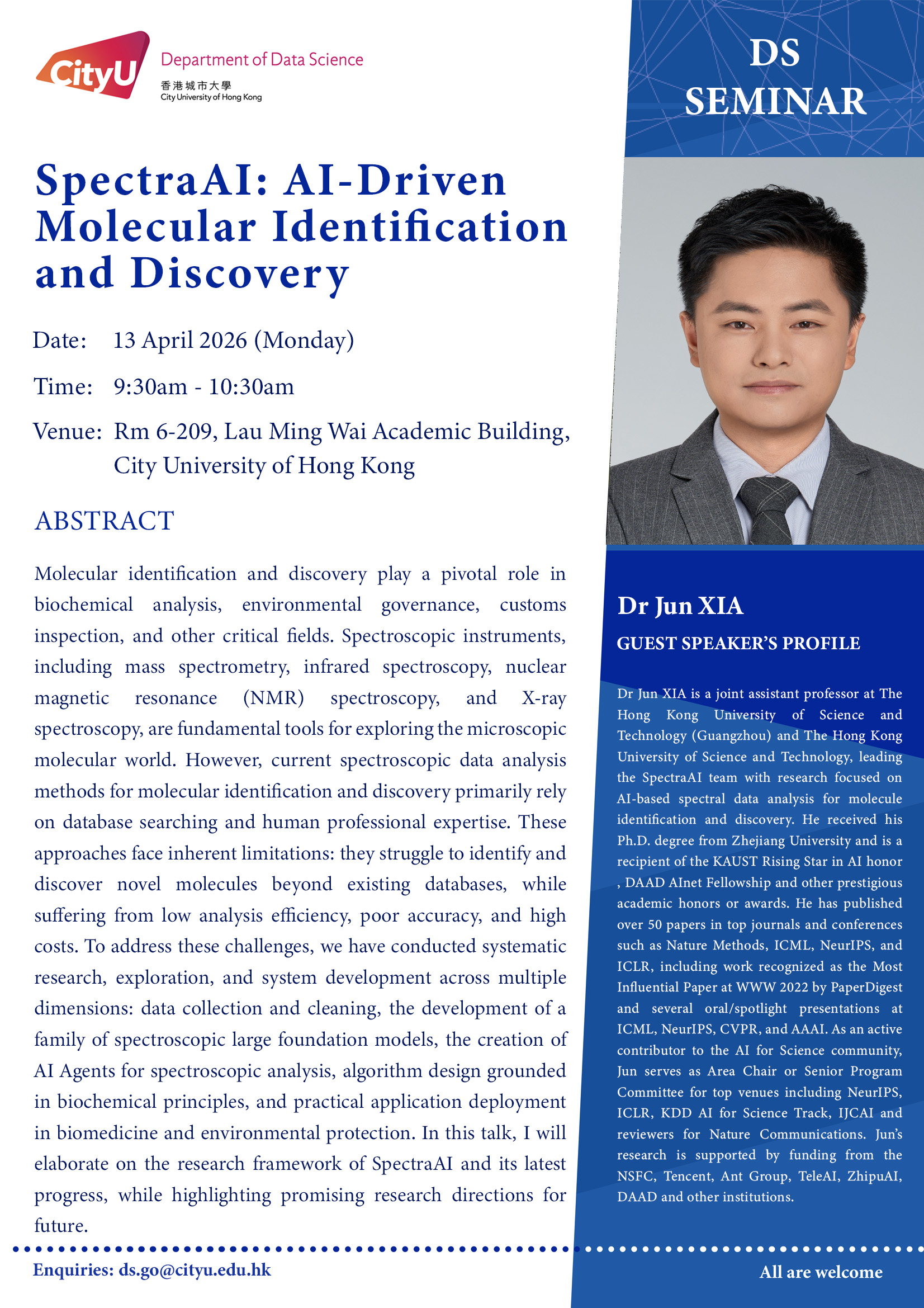 Dr Jun XIA is a joint assistant professor at The Hong Kong University of Science and Technology (Guangzhou) and The Hong Kong University of Science and Technology, leading the SpectraAI team with research focused on AI-based spectral data analysis for molecule identification and discovery. He received his Ph.D. degree from Zhejiang University and is a recipient of the KAUST Rising Star in AI honor , DAAD AInet Fellowship and other prestigious academic honors or awards. He has published over 50 papers in top journals and conferences such as Nature Methods, ICML, NeurIPS, and ICLR, including work recognized as the Most Influential Paper at WWW 2022 by PaperDigest and several oral/spotlight presentations at ICML, NeurIPS, CVPR, and AAAI. As an active contributor to the AI for Science community, Jun serves as Area Chair or Senior Program Committee for top venues including NeurIPS, ICLR, KDD AI for Science Track, IJCAI and reviewers for Nature Communications. Jun’s research is supported by funding from the NSFC, Tencent, Ant Group, TeleAI, ZhipuAI, DAAD and other institutions.