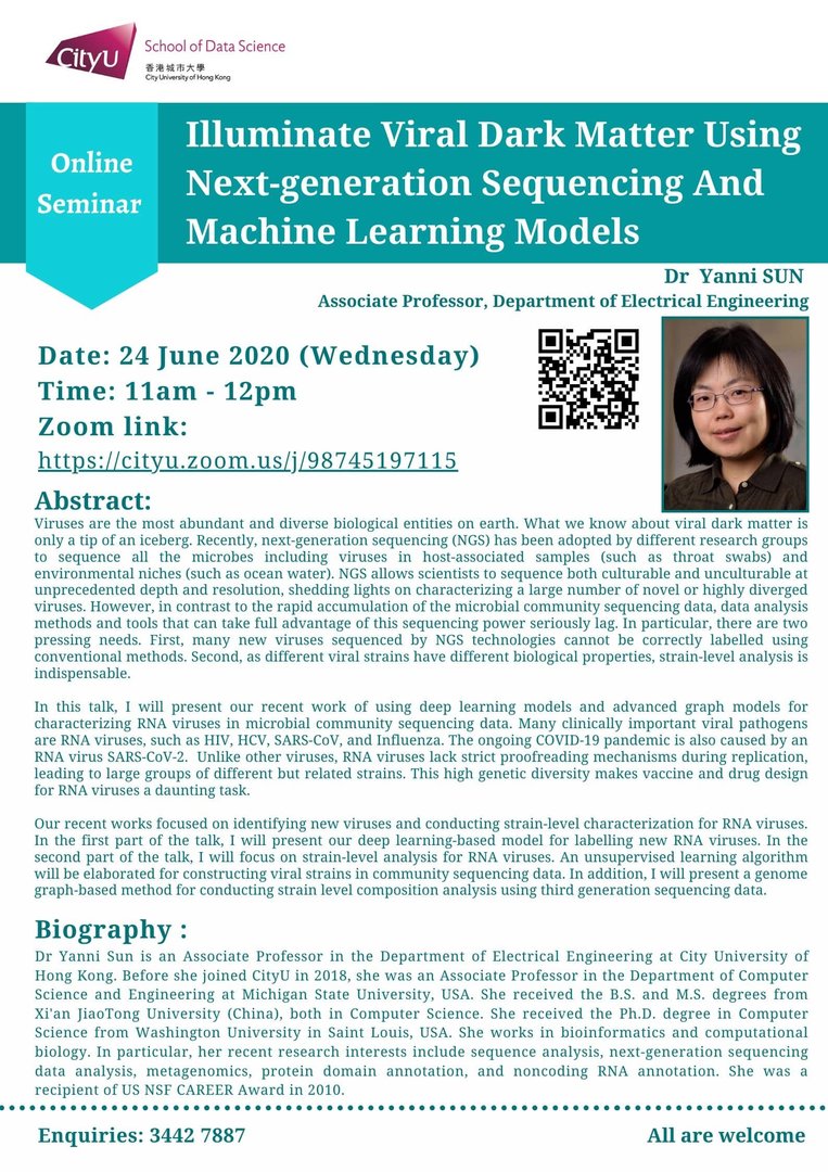 Dr Yanni Sun is an Associate Professor in the Depa rtment of Electrical Engineering at City University of Hong Kong. Before she joined CityU in 2018, she was an Associate Professor in the Department of Computer Science and Engineering at Michigan State University, USA. She received the B.S. and M.S. degrees from Xi'an JiaoTong University (China), both in Computer Science. She received the Ph.D. degree in Computer Science from Washington University in Saint Louis, USA. She works in bioinformatics and computational biology. In particular, her recent research interests include sequence analysis, next-generation sequencing data analysis, metagenomics, protein domain annotation, and noncoding RNA annotation. She was a recipient of US NSF CAREER Award in 2010.