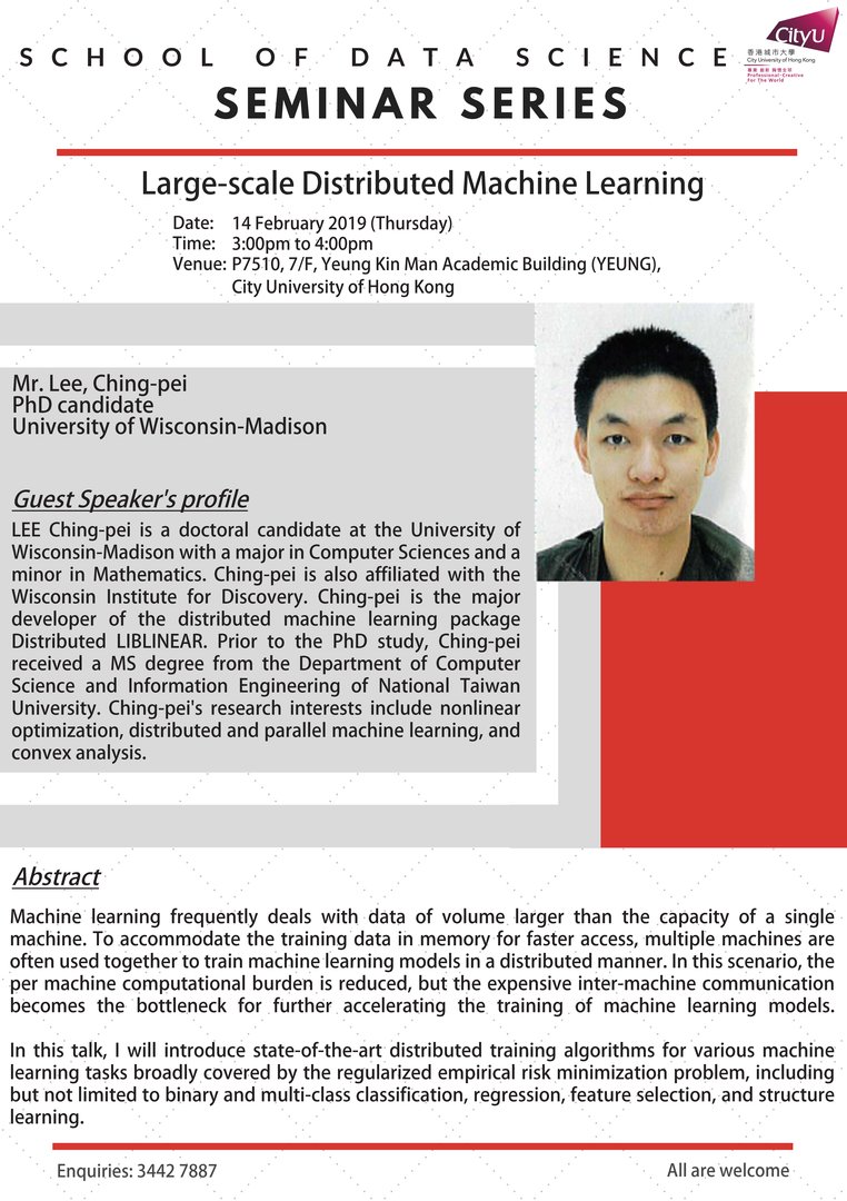 Mr LEE Ching-pei is a doctoral candidate at the University of Wisconsin-Madison with a major in Computer Sciences and a minor in Mathematics. Ching-pei is also affiliated with the Wisconsin Institute for Discovery. Ching-pei is the major developer of the distributed machine learning package Distributed LIBLINEAR. Prior to the PhD study, Ching-pei received a MS degree from the Department of Computer Science and Information Engineering of National Taiwan University. Ching-pei's research interests include nonlinear optimization, distributed and parallel machine learning, and convex analysis.