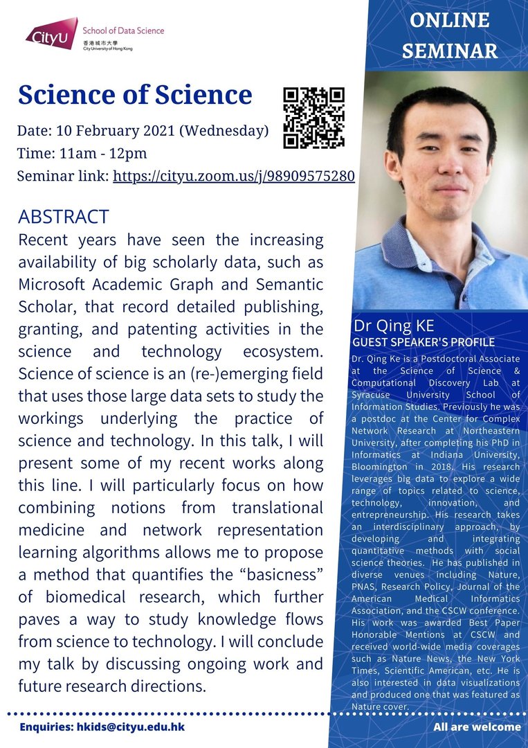 Recent years have seen the increasing availability of big scholarly data, such as Microsoft Academic Graph and Semantic Scholar, that record detailed publishing, granting, and patenting activities in the science and technology ecosystem. Science of science is an (re-)emerging field that uses those large data sets to study the workings underlying the practice of science and technology. In this talk, I will present some of my recent works along this line. I will particularly focus on how combining notions from translational medicine and network representation learning algorithms allows me to propose a method that quantifies the “basicness” of biomedical research, which further paves a way to study knowledge flows from science to technology. I will conclude my talk by discussing ongoing work and future research directions.