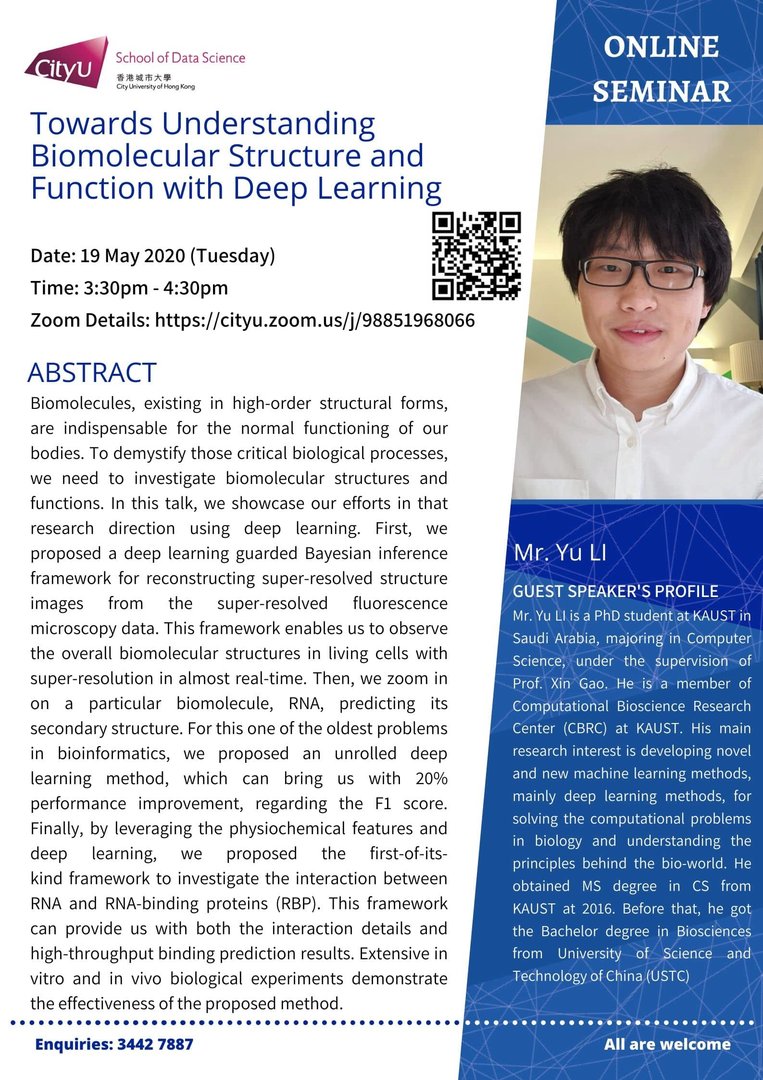 Mr Yu LI is a PhD student at KAUST in Saudi Arabia, majoring in Computer Science; under the supervision of Prof. Xin Gao. He is a member of Computational Bioscience Research Center (CBRC) at KAUST. His main research interest is developing novel and new machine learning methods, mainly deep learning methods, for solving the computational problems in biology and understanding the principles behind the bio-world. He obtained MS degree in CS from KAUST at 2016. Before that, he got the Bachelor degree in Biosciences